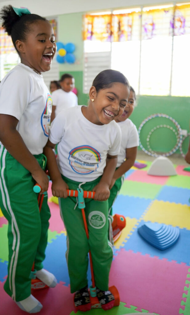 Niñas del Centro Educativo Hogar Escuela Nuevos Horizontes, del municipio Duvergé, en la provincia Independencia, se divierten en el Aula de Psicomotricidad inaugurada por el Instituto Nacional de Educación Física (INEFI) en ese centro educativo.