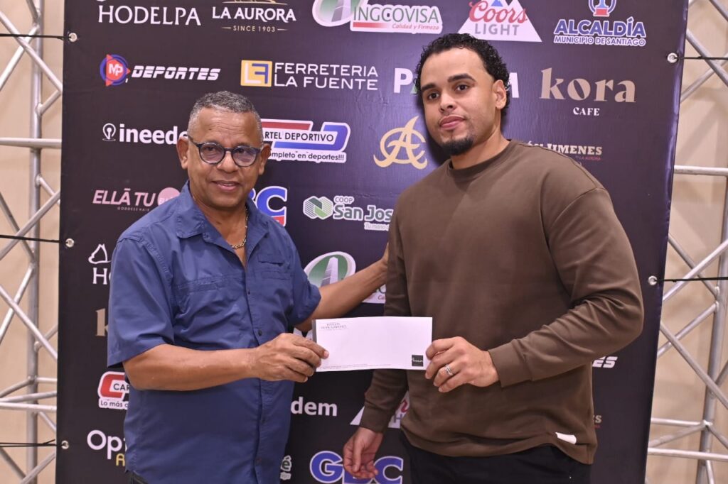 Apolinar Peralta y Diosmayra Rodríguez premian a Aderlin Rodríguez.