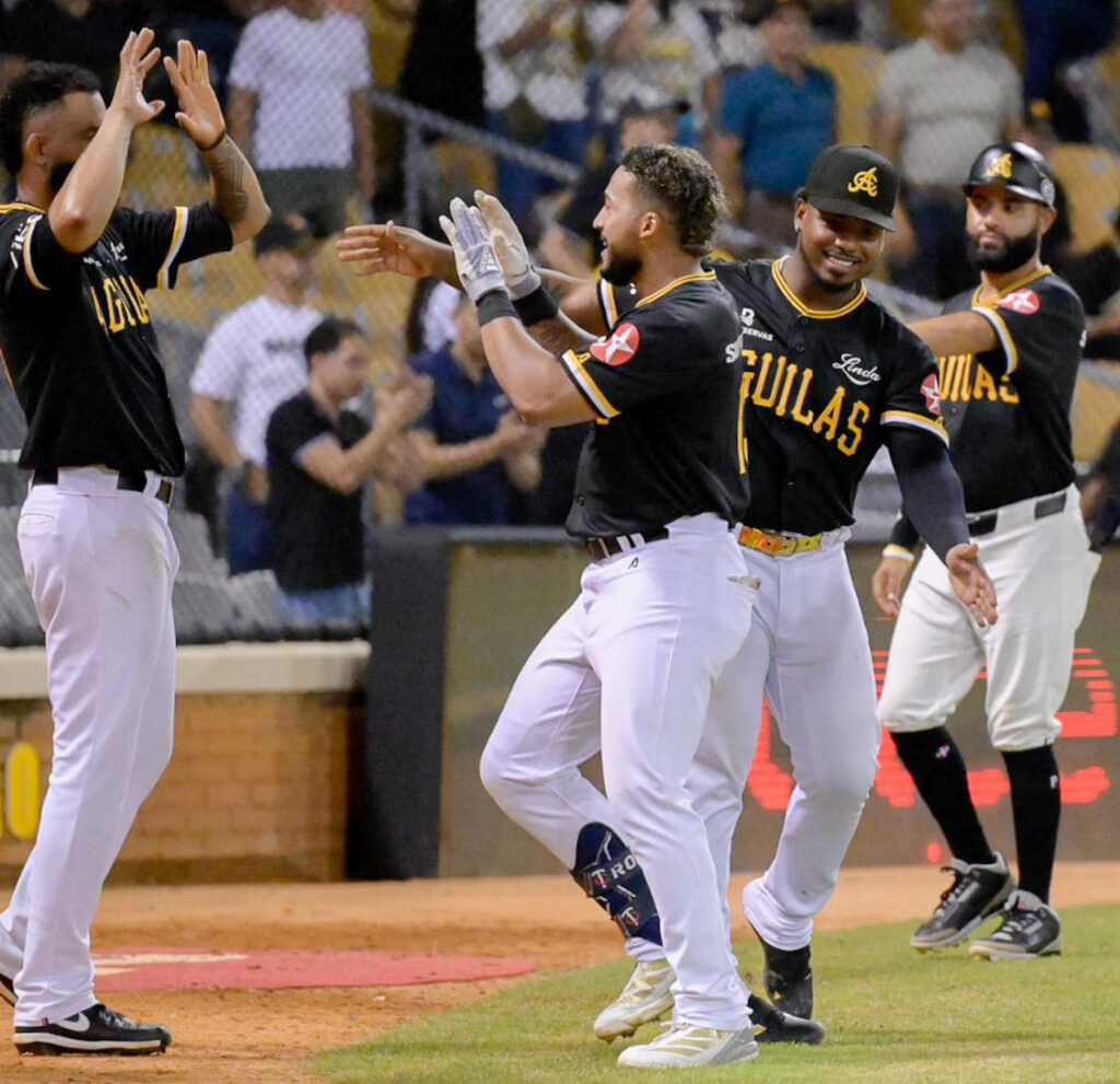 Las Águilas ripostaron en el cierre del episodio con 3 anotaciones: sencillos corridos de Leody Taveras y Ezequiel Durán, transferencia a JC Escarra, elevado de sacrificio de Aderlin Rodríguez que igualó la pizarra; cuatro malas a José Rodríguez llenaron las almohadillas y, cuando el cátcher Cooper Johnson intentó sorprenderlo, botó la pelota, anotando Durán y Escarra.
