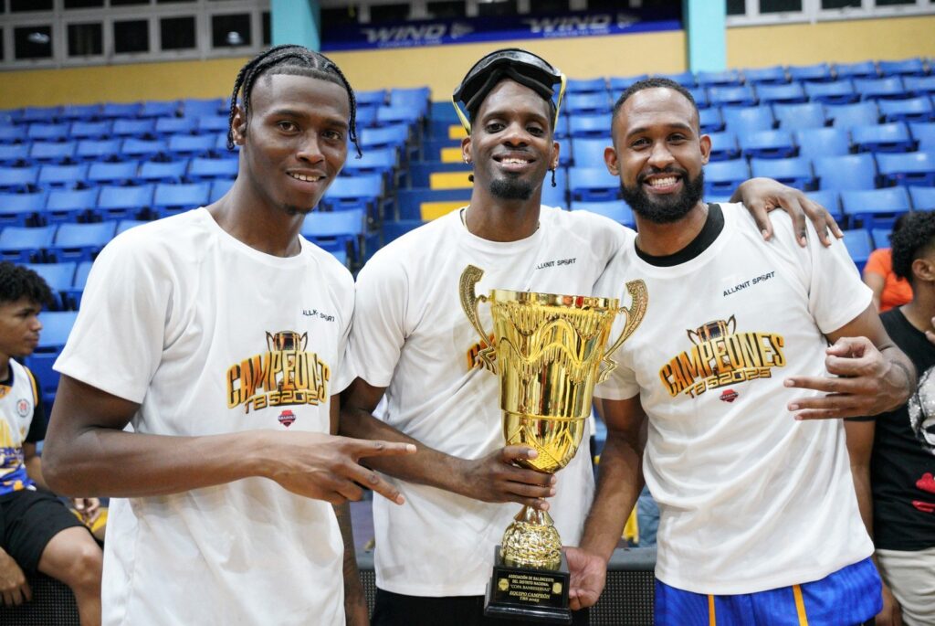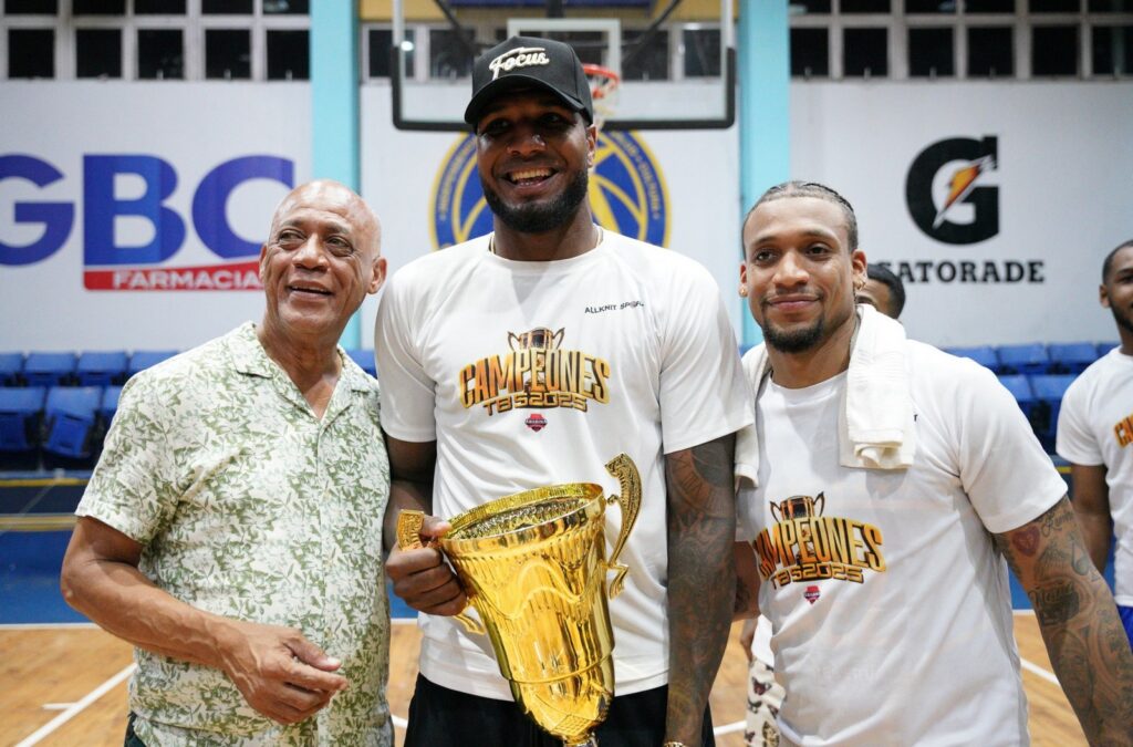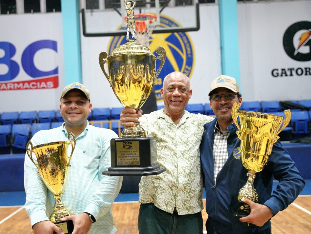 La Copa BanReservas que se disputó en el TBS Distrito 2025 fue entregada por el periodista Daniel García Archivald, vicepresidente de Relaciones Públicas de BanReservas, junto a Diego Pesqueira, presidente de la Asociación de Baloncesto del Distrito Nacional (Abadina); y al Comisionado del TBS Distrito 2025, Nelson Ramírez.