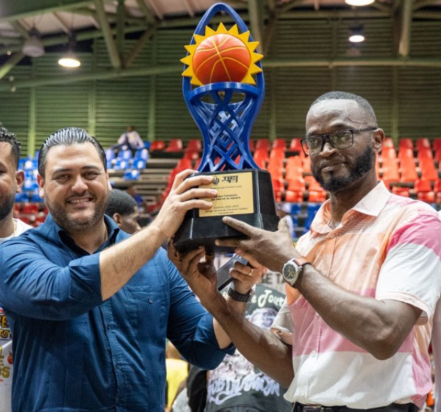 Jorge Tavárez, presidente de Abapa, tuvo a cargo la entrega de la Copa Punta Cana, que patrocinó el Grupo Punta Cana, a los tres veces campeones de los TBS Higüey, el club Antonio Guzmán, que recibió su presidente, el dirigente deportivo Moisés Mercedes.