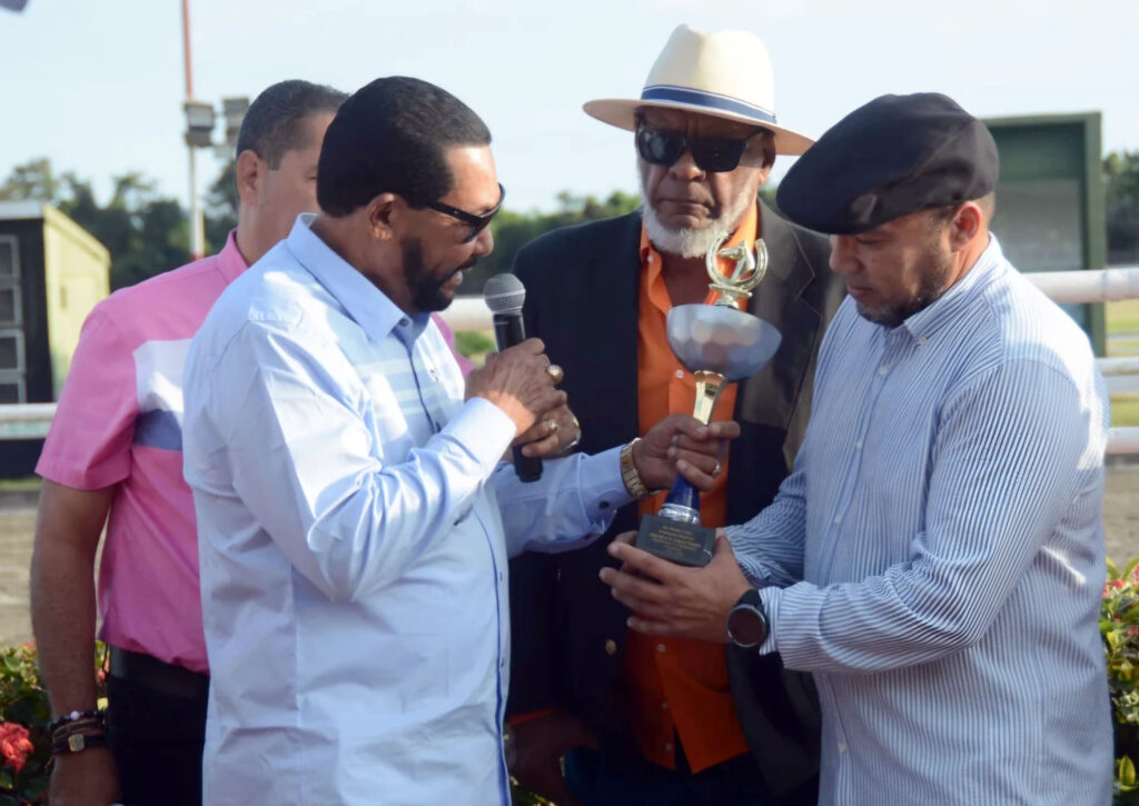 Pedro Cedeño (derecha) recibe de Porfirio de Jesús (izquierda) el Trofeo Orientación Hípica, por la victoria este sábado de su caballo Counsellor (2), en la quinta carrera del cartel #11 del año. En el centro, Manuel Romero (El Galán) productor del programa Orientación Deportiva. Detrás (parcialmente oculto), Rafael Díaz, director de comunicaciones de la Comisión Hípica Nacional.