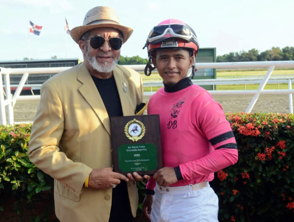 El jinete José Villalobos (derecha) recibe de Johnny Morillo (izquierda) una placa como jinete del ejemplar ganador (Counsellor) del Trofeo Orientación Deportiva, a nombre del programa hípico del mismo nombre, el cual se disputó este sábado, en nuestro Hipódromo V Centenario.